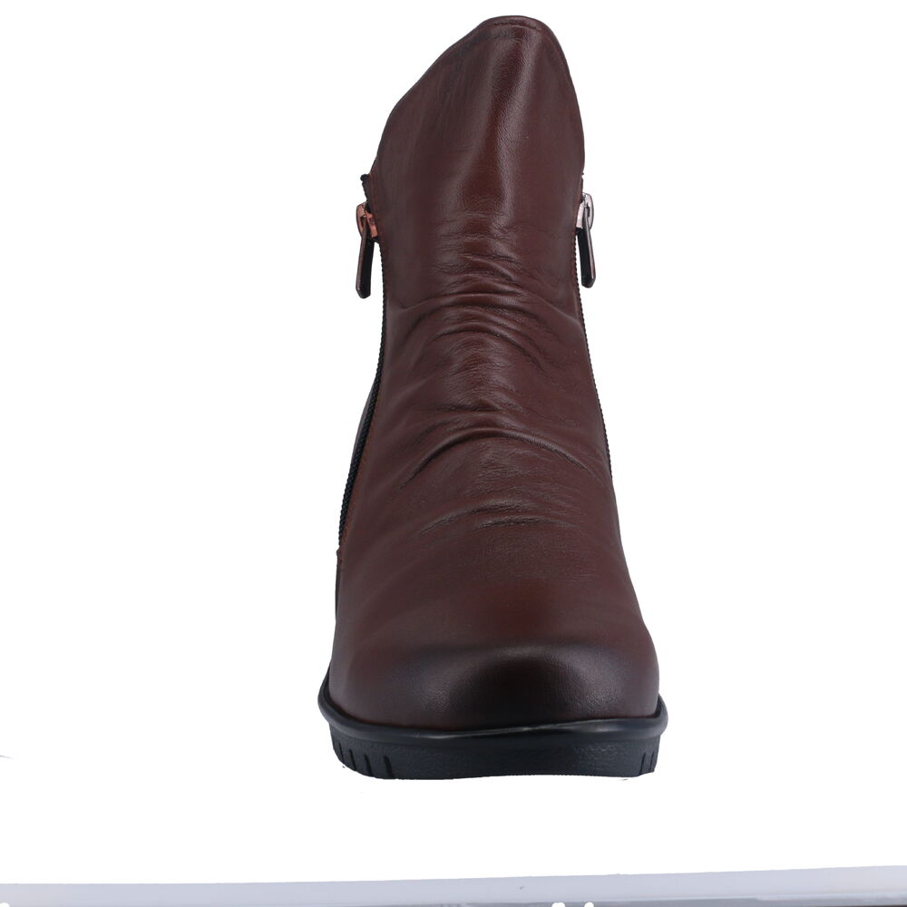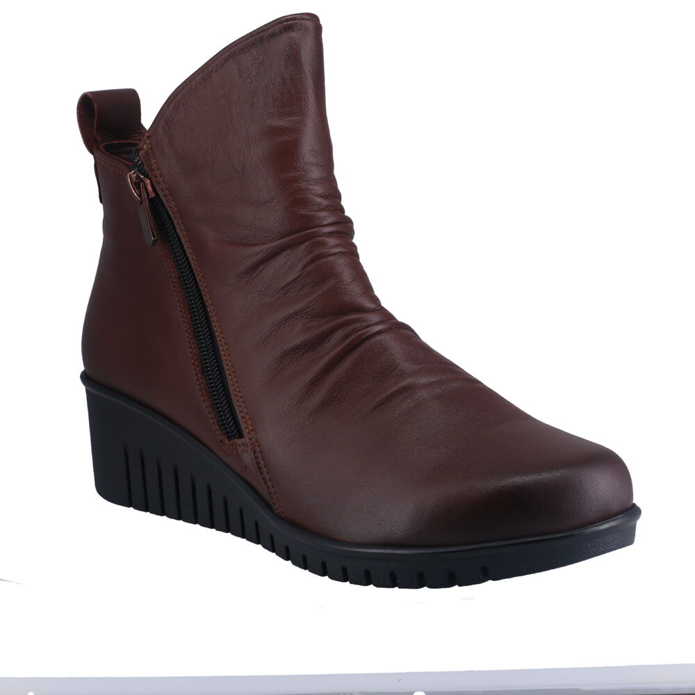 The Cabello Ella women's boot is crafted from glove-soft leather, ensuring both comfort and style. It features dual side zippers for easy wear and removal, complemented by a lightweight rubber outsole with a 50mm wedge heel, offering subtle elevation without compromising on stability.
