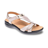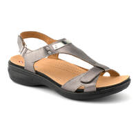 - V strap design with backstrap and metal trim